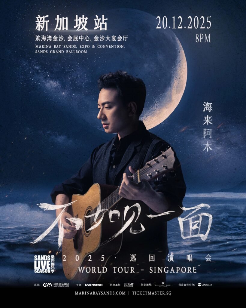海来阿木《不如见一面》巡回演唱会 – 新加坡站将在2025年12月20日 (六) 晚上8点于滨海湾金沙会议展览中心,第5层,金沙大宴会厅举行。万事达卡电持卡者可在9月15日 (一) 早上10点至晚上11点59分预先购票。此外,9月17 日 (三) 早上10点起也将开放精选预留席位供万事达卡持卡人专享购票。欲知更多详情,请上www.priceless.com/music查询。