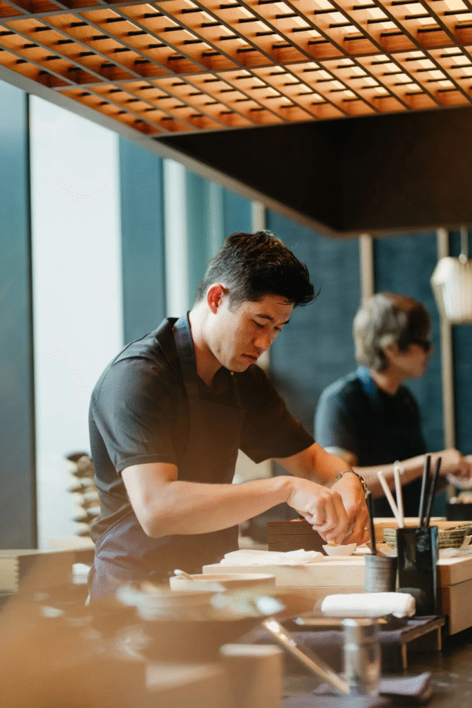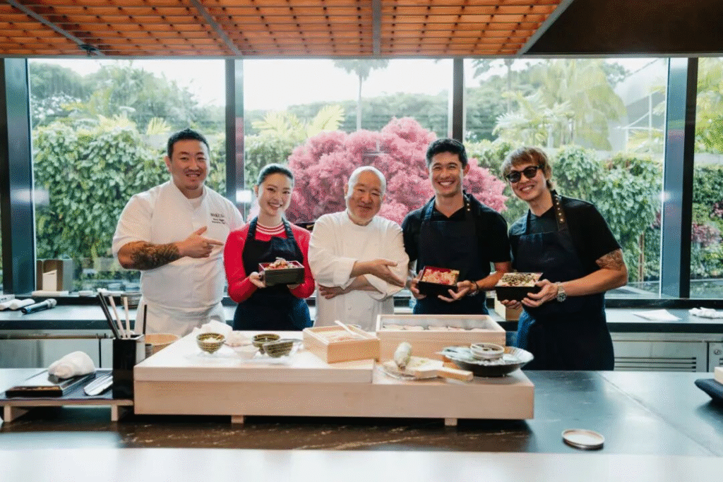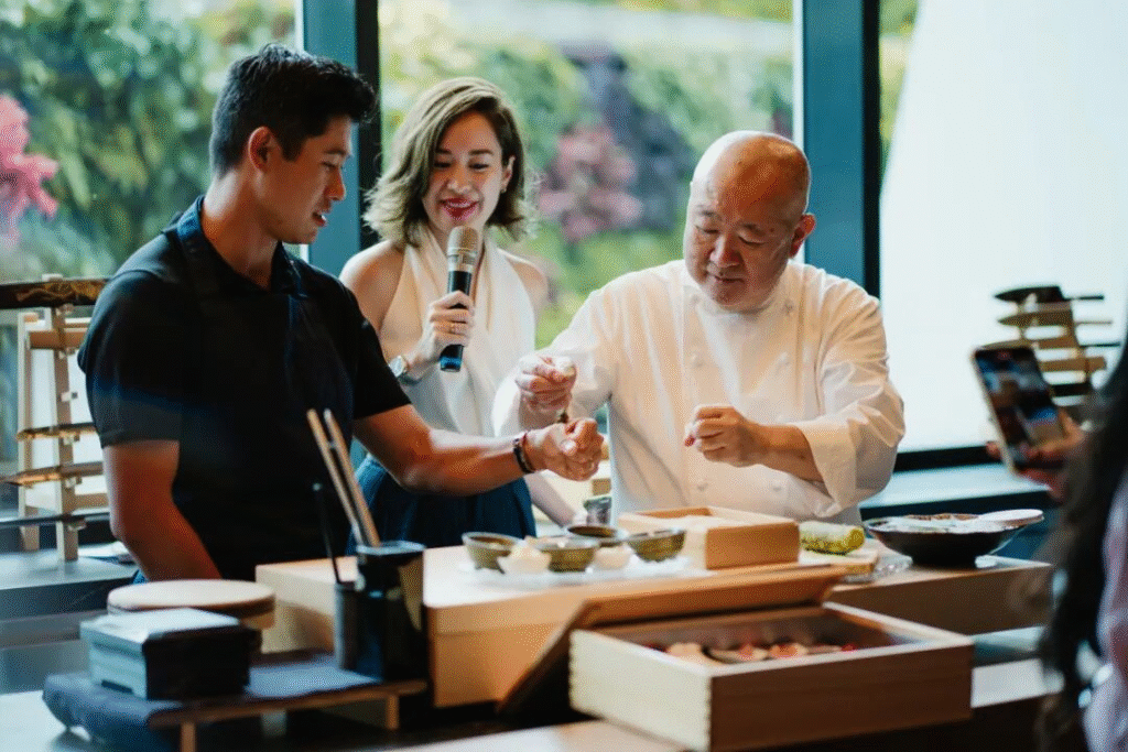 当天的庆祝活动在WAKUDA继续进行,森川在那里放下了他的高尔夫球杆,换上了筷子,与新加坡资深电台DJ Glenn Ong以及本地企业家和社交媒体名人Christabel Chua进行了一场友好的厨艺比拼。传奇厨师Tetsuya Wakuda和WAKUDA新加坡的行政总厨Pavel Nigai出任这次名为“Life Beyond Course”比赛的评委。比赛中给,三名参赛者巧妙地制作了色彩鲜艳的寿司饭盖饭,体现了WAKUDA“旬”(Shun)的烹饪理念,即对当季食材处于最佳状态的赞颂。WAKUDA仅使用最新鲜的农产品,展示了优质的寿司切块,而厨师Tetsuya则通过他精湛的刀工展示了日本烹饪艺术的精细,为参与者提供了精准和技巧的典范。