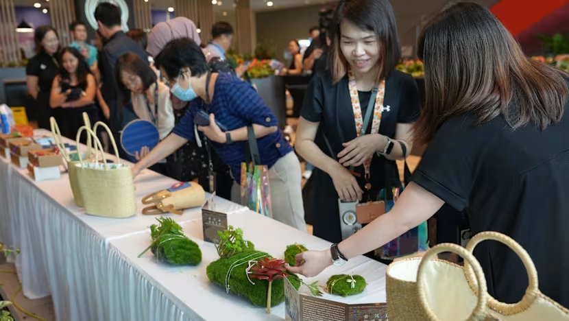 Once used to make slippers and household ware adorned with ethnic motifs, huangcao is now fashioned into contemporary items such as cup sleeves, coasters, handbags and souvenirs. At the exhibition, straw bags emblazoned with “I love Singapore” were among the highlights.