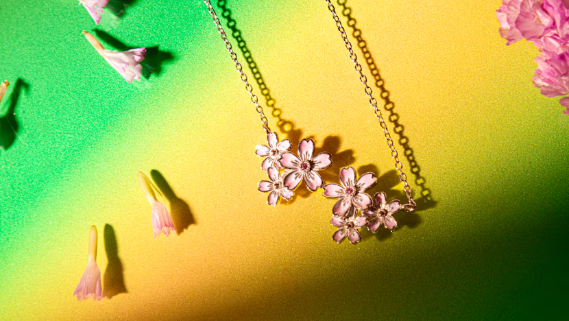 An enamel necklace by heritage brand Lao Feng Xiang, featuring cherry blossoms in bloom. Photo: Lao Feng Xiang