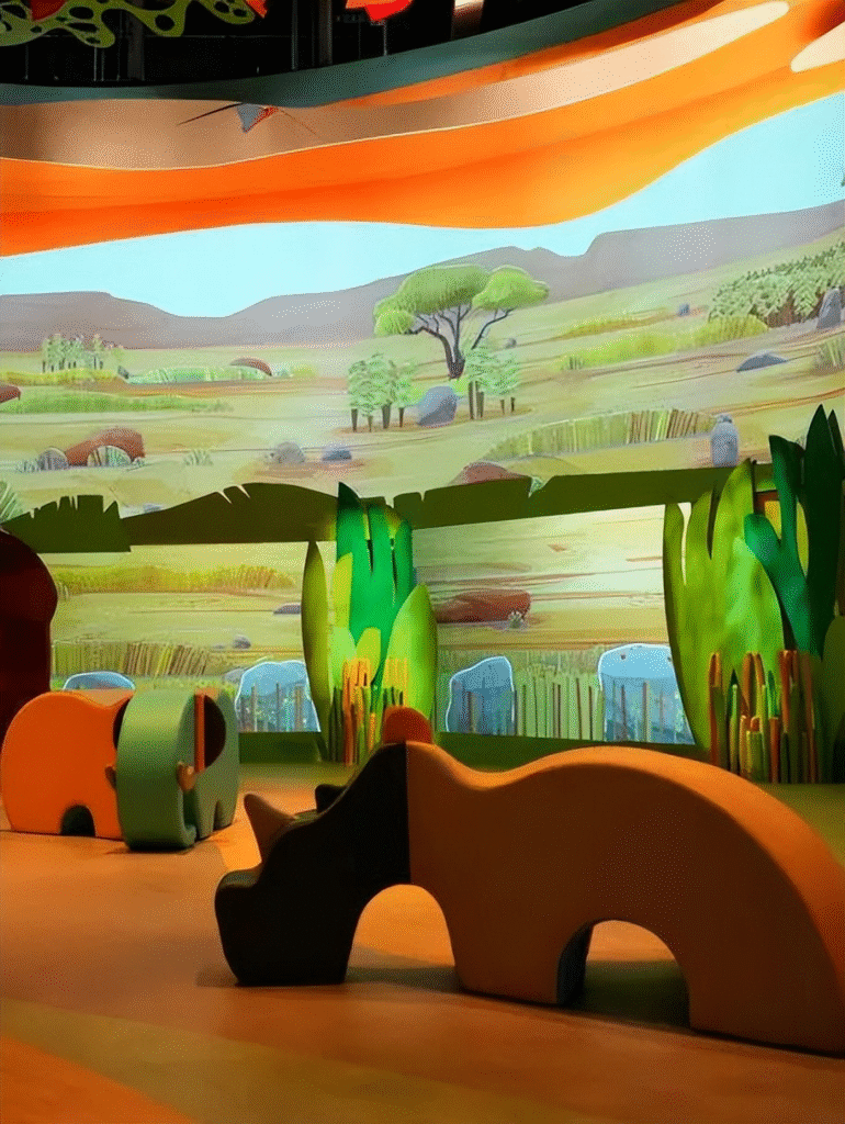 在草原区的水塘(Watering Hole),孩子们可以化身为野生动物,亲眼目睹非洲大迁徙的动画全景。