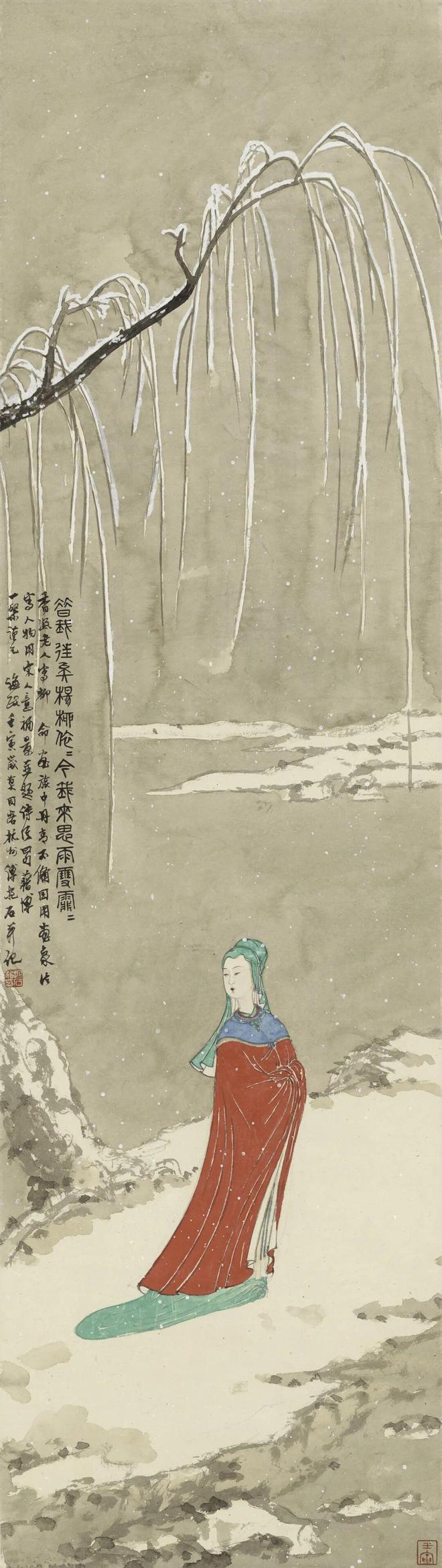△左图:何香凝,《高松立海隅》,1960年。设色纸本,135×140厘米。何香凝美术馆馆藏。右图:何香凝、傅抱石,《赏雪图》,1962年。设色纸本,132×37厘米。何香凝美术馆藏。
