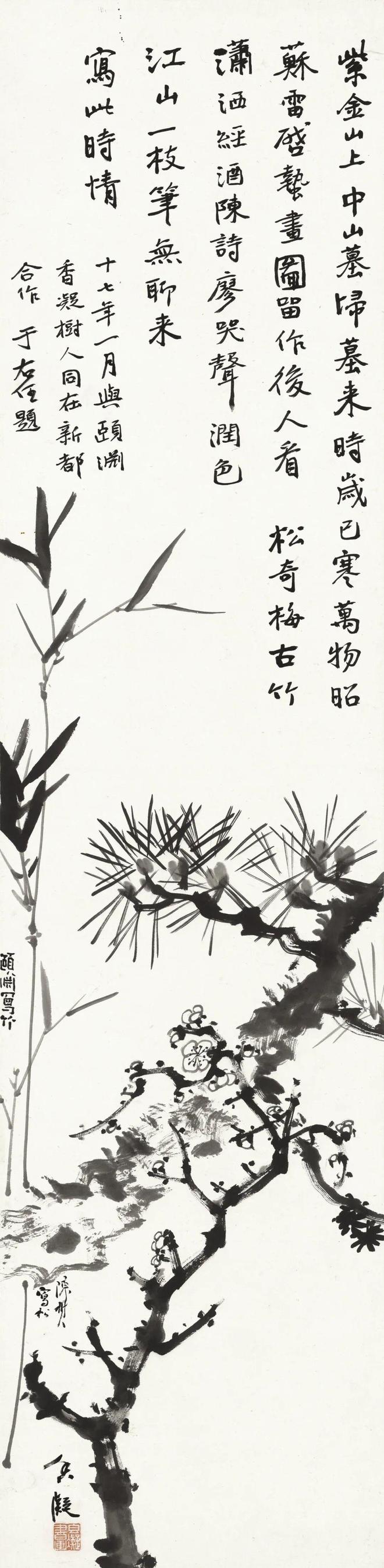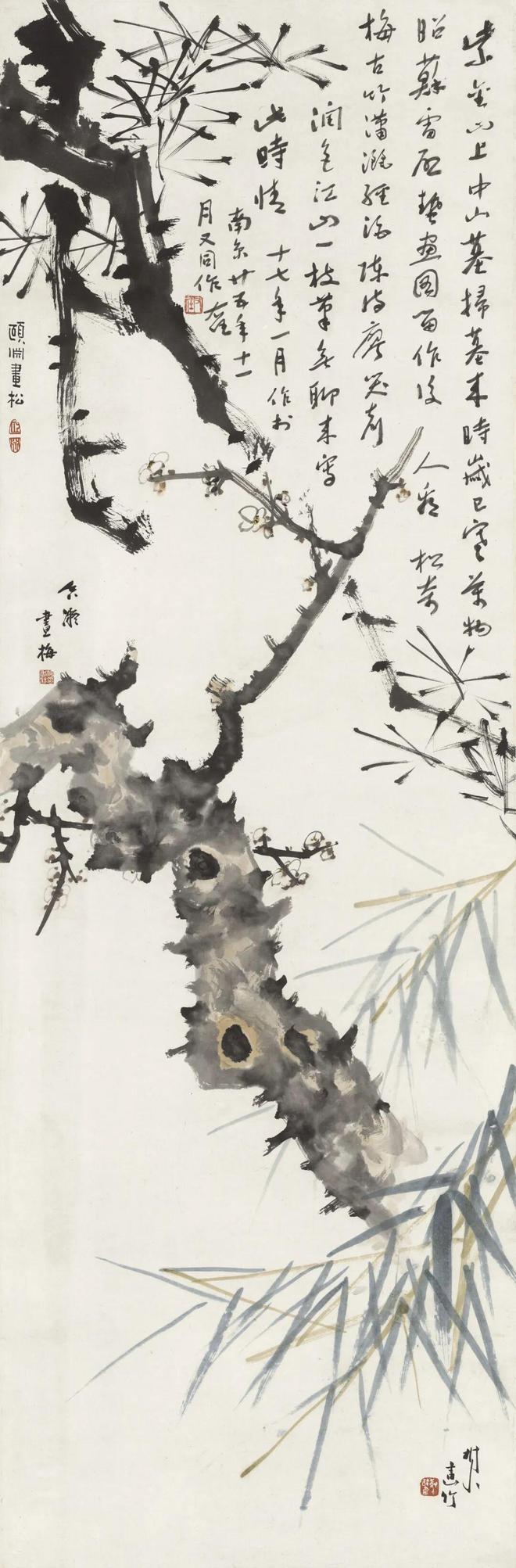 △左图:何香凝、经亨颐、陈树人、于右任,《松·竹·梅》,1928年。水墨纸本,137×34厘米。何香凝美术馆馆藏。右图:何香凝、经亨颐、陈树人、于右任,《松·竹·梅》,1936年。设色纸本,143×47.4厘米。何香凝美术馆馆藏。