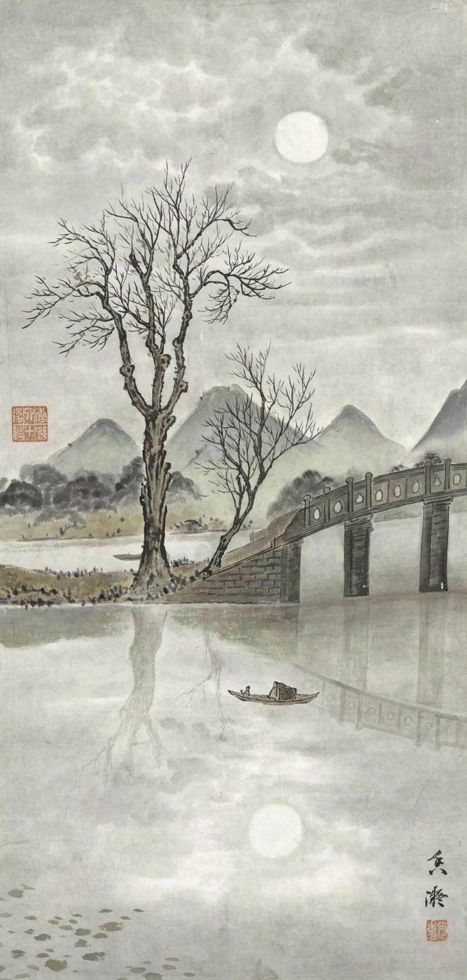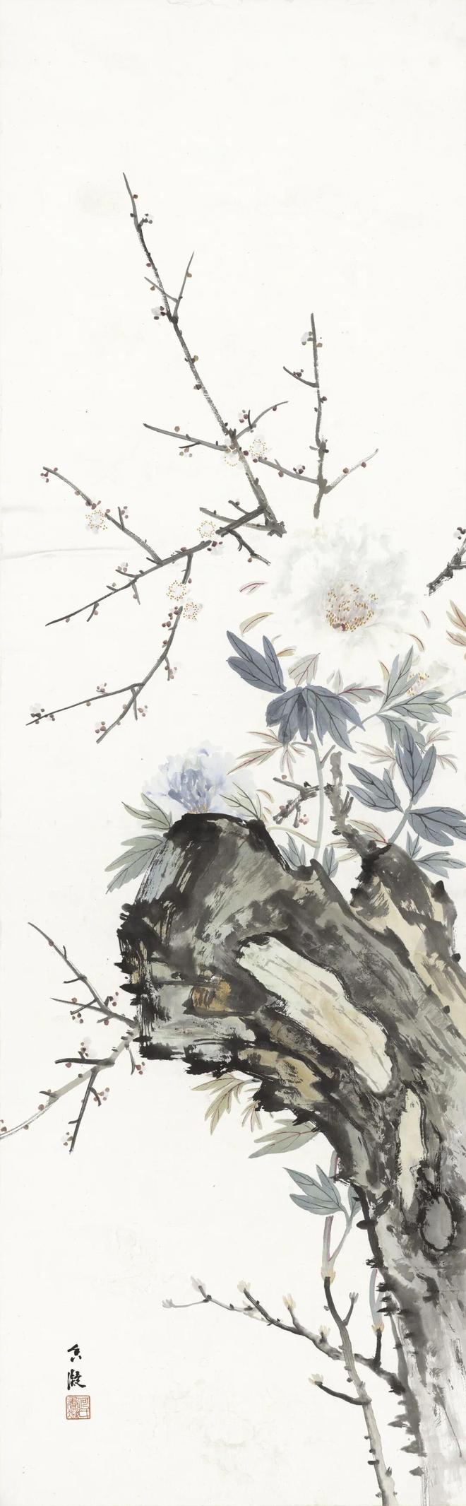△左图:何香凝,《梅石牡丹》,约1920年代。设色纸本,146×45厘米。何香凝美术馆馆藏。何香凝,《月下小景》,约 1920年代。设色纸本,80×38厘米。何香凝美术馆馆藏。