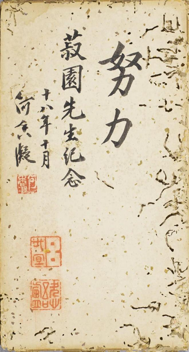 △何香凝,《努力》,邱菽园先生纪念,约十八年(1929年)十月。水墨纸本,《林则徐墨宝册》内页。王清建与家属,丘菽园后人藏品。